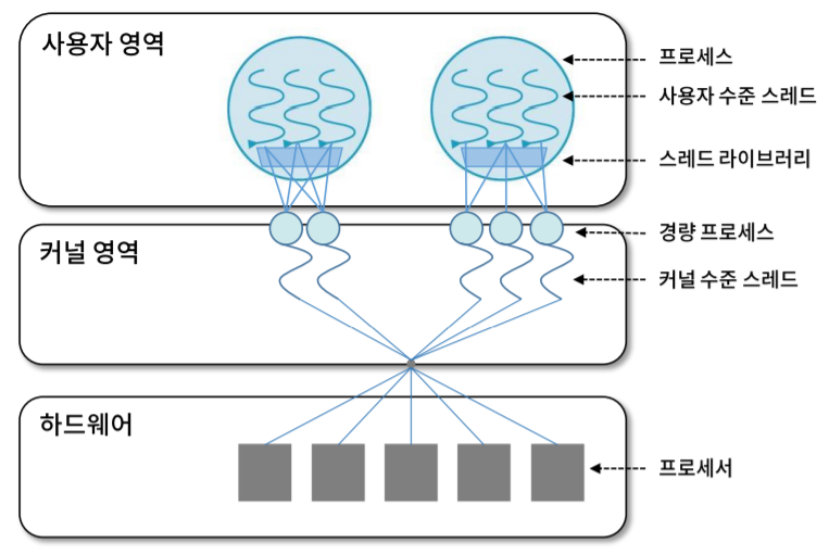사용자 영역의 스레드 라이브러리로 구현됨