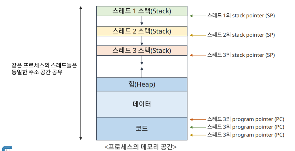 stack이외의 메모리 공간(data, heap, code) 다른 스레드와 공유