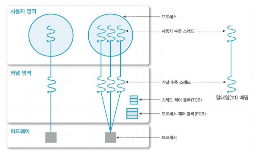 kernel 영역에서 스레드 생성, 관리 수행(부하가 큼)