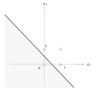 OR게이트는 (x1, x2) = (0,0) 일 때 0, (x1, x2) = (1,0), (0,1), (1,1)일 때 1이다. 그래프를 보면 직선이 이 두 영역을 분할하는 것을 알 수 있다. 즉, 단층 퍼셉트론은 이처럼 "직선"으로 나뉜 두 영역을 만든다.
