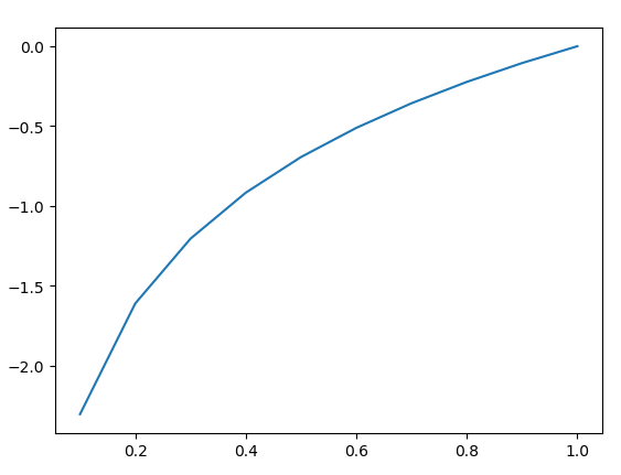 위는 자연로그의 그래프이다. x가 1일 때 y=0, x가 0에 가까워질수록 y는 작아지고 음의 무한대로 발산한다.
