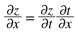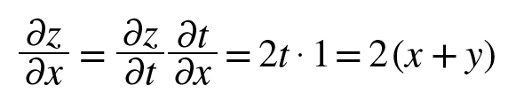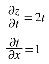 예컨대, z = (x + y)^2라는 함수는 [z = t^2, t = x+y]라는 두식으로 나타낼 수 있고, z의 x에 대한 미분은 아래와 같이 구한다.