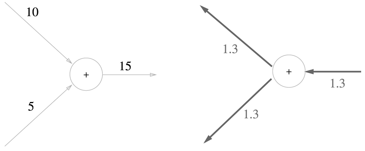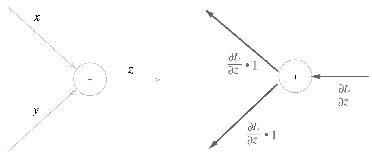 z = x + y라는 식을 생각해보자. 그럼 dz/dx = 1, dz/dy = 1이다. 이는 계산그래프로 아래와 같이 나타낼 수 있다.