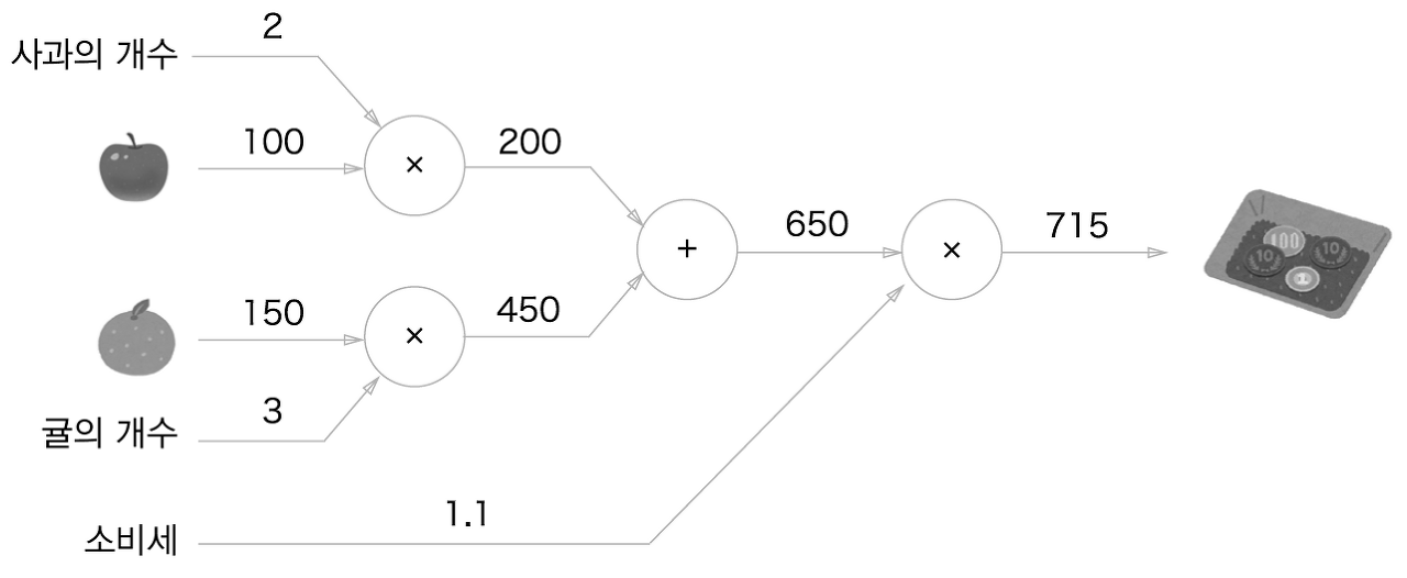 초반에 언급한 사과, 귤 문제에 역전파를 적용해 그래프로 나타내면 아래와 같다.