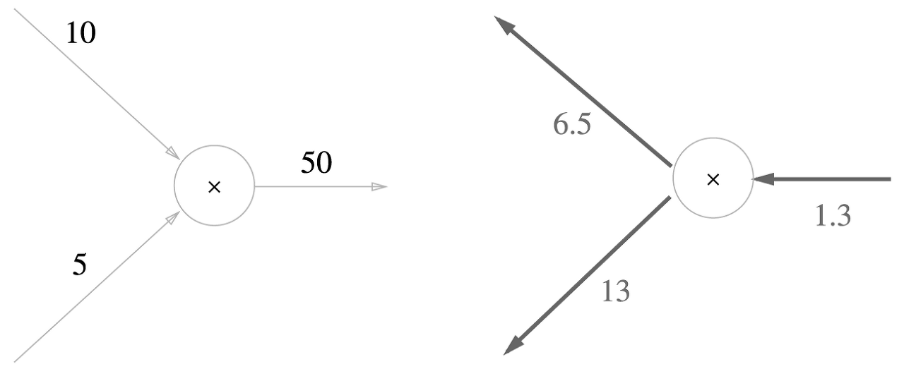 즉, 곱셈노드의 역전파는 상류로부터 전달받은 값에 순전파 때의 입력신호들을 서로 바꾼 값을 곱해 하류로 보낸다. 예시는 아래와 같다.