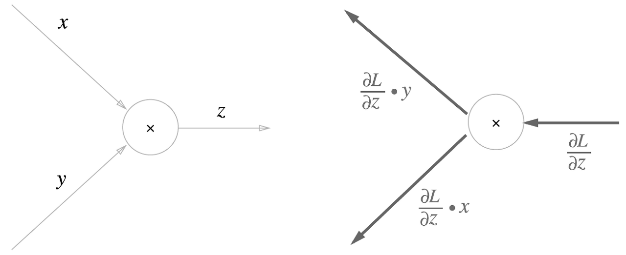 z = xy라는 식을 생각해보자. 그럼 dz/dx=y, dz/dx=x이다. 계산그래프는 다음과 같다.