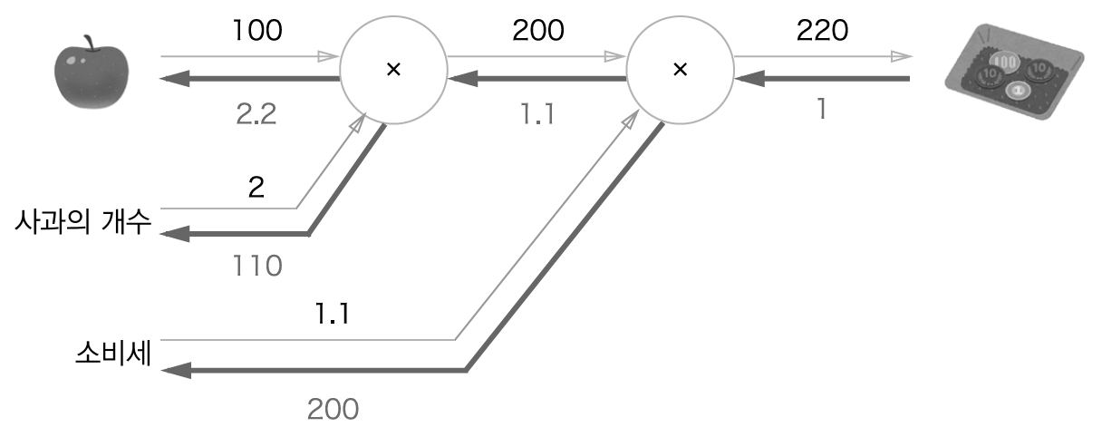 위의 개념들을 가지고 사과쇼핑을 역전파로 나타낸 그래프는 아래와 같다. 가장 왼쪽의 세 수 2.2, 110, 200은 각각 '사과 가격에 대한 지불금액의 미분', '사과 갯수에 대한 지불금액의 미분', '소비세에 대한 지불금액의 미분' 값이다. 해석하자면 소비세와 사과 가격이 같은 양만큼 오르면 최종금액에 소비세가 200의 크기로, 사과가격이 2.2의 크기로 영향을 준다는 것이다.