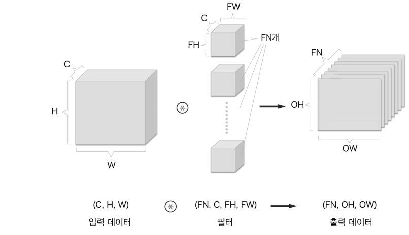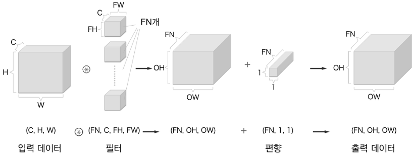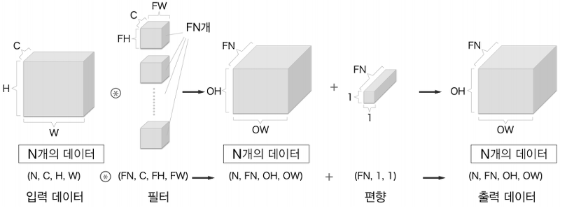 - 신경망에 4차원 데이터가 하나 흐를 때마다 데이터 N개에 대한 합성곱 연산이 이루어지는 것