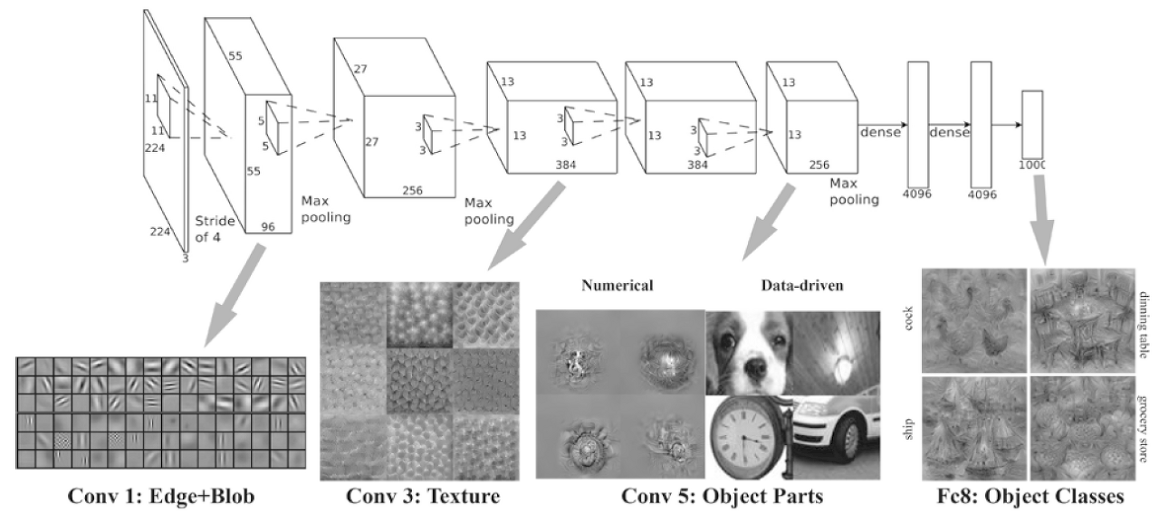 - 위의 이미지와 같이 층이 깊어지면서 뉴런이 반응하는 대상이 단순한 모양에서 '고급' 정보로 변화