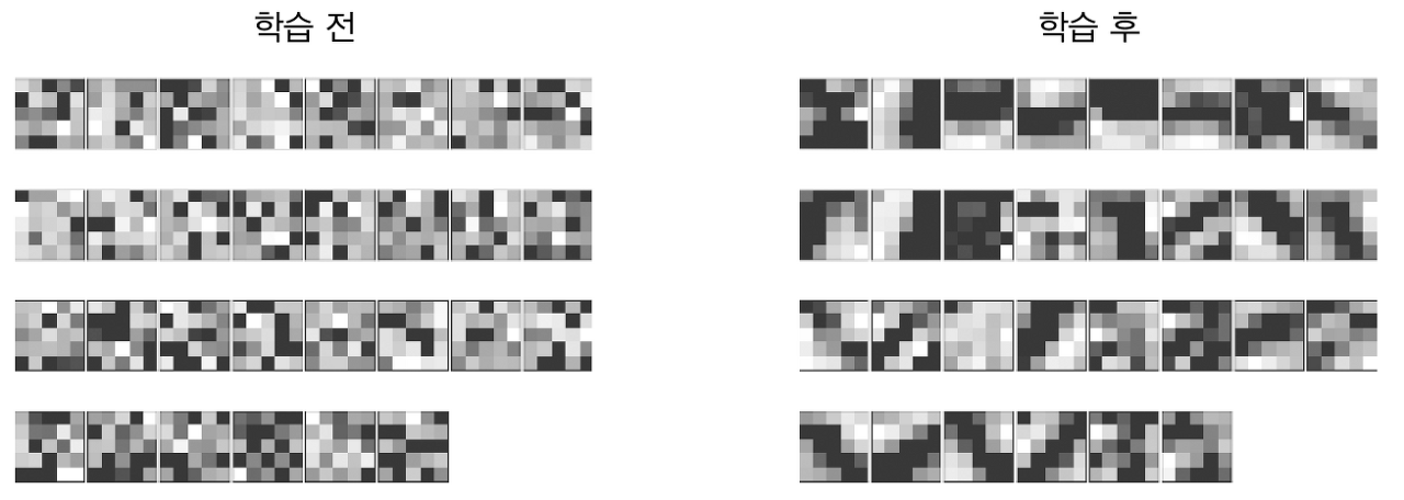 - 학습 전 필터는 무작위로 초기화되고 있어 흑백의 정도에 규칙성 無