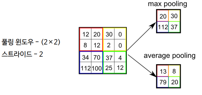 - 풀링 : 가로, 세로 방향의 공간을 줄이는 연산(2x2이상되는 크기의 영역을 원소 하나로 집약)
