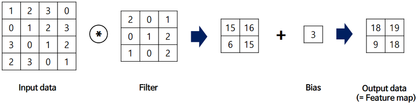 - 아래 그림과 같이 입력과 필터에서 대응하는 원소끼리 곱한 후 그 총합을 구함