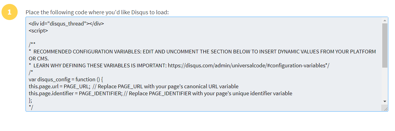 Place the following code where you'd like Disqus to load에 나오는 HTML코드를 자신의 웹사이트 HTML 소스에 붙여넣기를 한다.