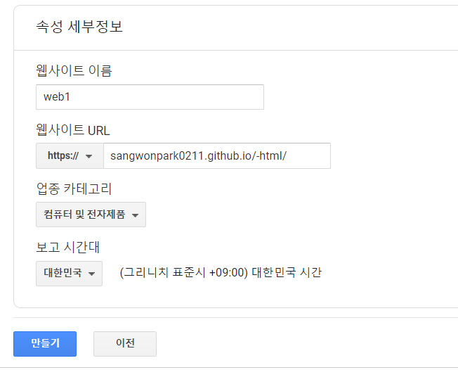 속성 설정에서 웹사이트 이름과 url, 카테고리, 시간대를 설정 후 만들기 클릭.
