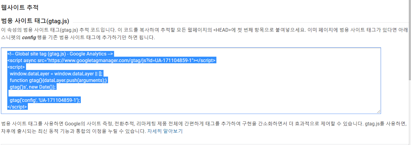 그 후, 나오는 HTML 추적 코드를 복사해 head 태그 안에 넣어주면 끝!