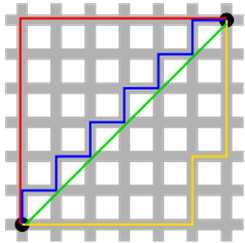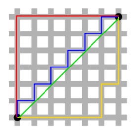 - 검정색 두 점 사이의 L1 Norm은 빨강, 파랑, 노랑색 선으로 표현 가능
