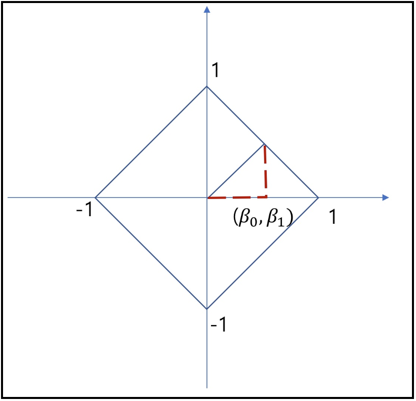 - β = [ β 0 , β1]이고, L1과 L2 Norm의 결과가 모두 1일 때, β의 존재가능 영역은 아래와 같다.