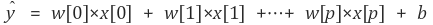 여기서 특성은 총 p+1개, 그에 따라 가중치도 p+1개이다. 주어진 여러 샘플들의 p+1개의 특징(x[0]~x[p])과 라벨값(y) 사이의 관계를 잘 나타내주는 w와 b를 찾아야 한다. 특징이 1개인 선형 회귀에선 모델이 직선이었지만, 2개면 평면이 되고, 그 이상이면 초평면(hyperplane)이 된다.