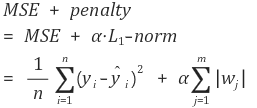 기존의 선형 회귀에선 적절한 가중치와 편향을 찾아내는 것이 관건이었다. 라쏘는 거기에 추가적인 제약 조건을 준다. 바로 MSE가 최소가 되게 하는 가중치와 편향을 찾으면서 동시에, 가중치들의 절댓값의 합이 최소가 되게 한다는 것이다. 다시 말해, 가중치의 모든 원소가 0이 되거나 0에 가깝게 되도록 해야 한다. 따라서 어떠한 특징들은 모델을 만들 때 사용되지 않기도 한다. 어떤 벡터 요소의 절댓값의 합은 L1-norm이다. 즉, 라쏘는 L1-norm 페널티를 가진 선형 회귀 방법이다. 식은 아래와 같다.