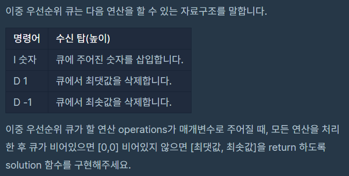 원소는 “명령어 데이터” 형식으로 주어집니다.- 최댓값/최솟값을 삭제하는 연산에서 최댓값/최솟값이 둘 이상인 경우, 하나만 삭제합니다.