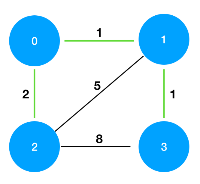 costs를 그림으로 표현하면 다음과 같으며, 이때 초록색 경로로 연결하는 것이 가장 적은 비용으로 모두를 통행할 수 있도록 만드는 방법입니다.