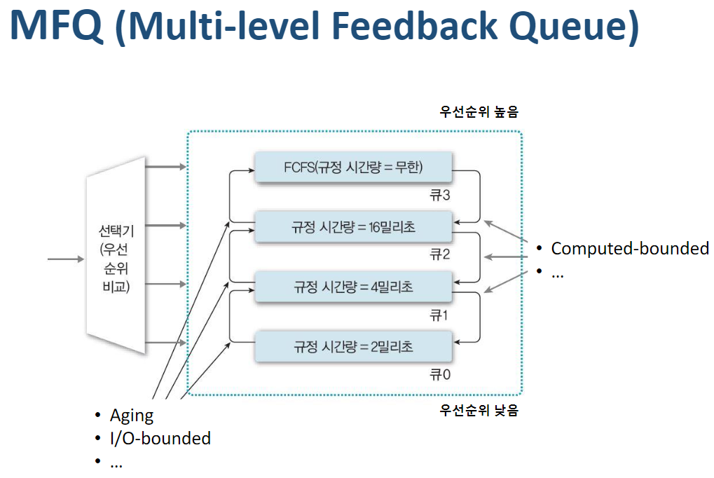 - 대기 시간이 지정된 시간을 초과한 프로세스들 상위 큐로 이동(aging)