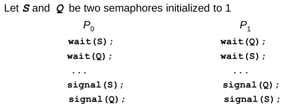 - Deadlock : 두 개 이상의 프로세스가 서로 상대방의 작업이 끝나기만을 기다리면서 다음 단계로 진행하지 못하는 상황 -> 여러 프로세스가 부족한 동일 자원 점유를 요청할 때 발생