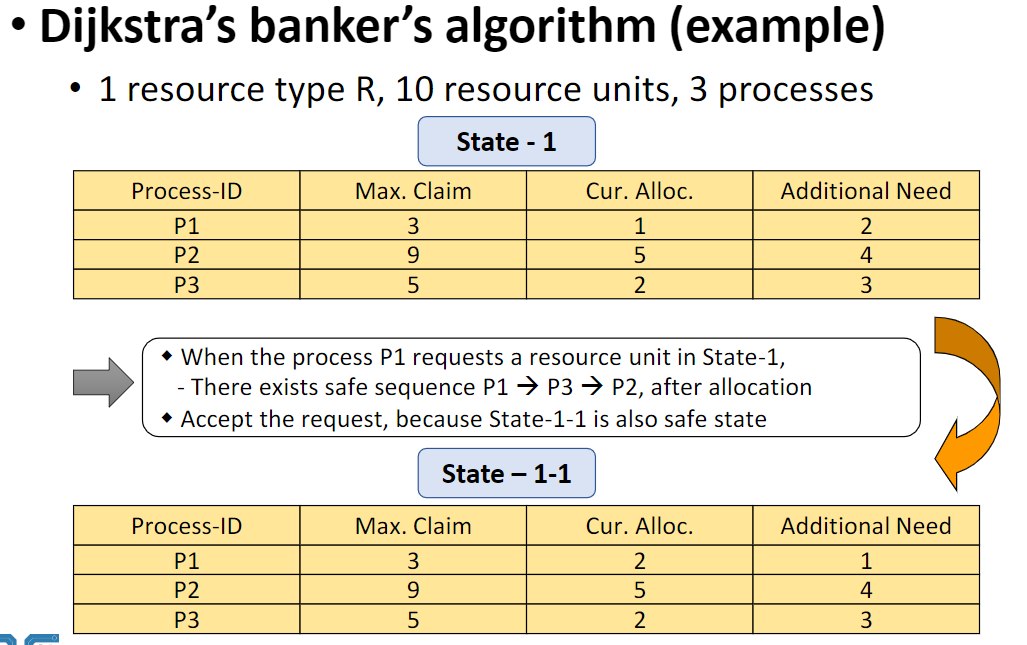 - safe-state : 모든 프로세스가 정상적 종료가 가능한 상태로 safe sequence가 존재