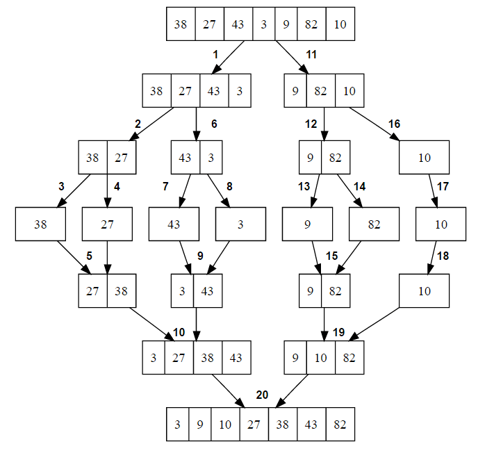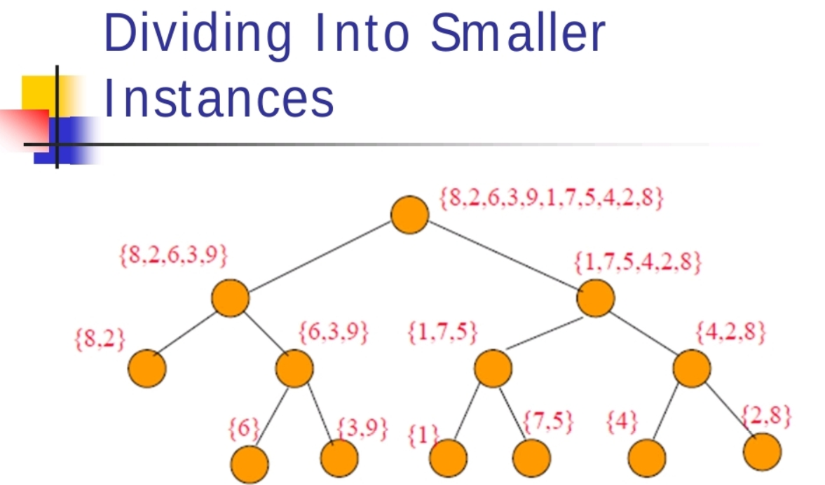 - 먼저 large set을 두 그룹으로 나누고, 나누어진 그룹에서 다시 두 그룹으로 나누고....이러한 과정을 풀기에 아주 단순한 small set이 될 때까지 반복한다. 즉, set의 원소 갯수 n이 2개 이하가 될 때까지 하는 것이다.(분할)