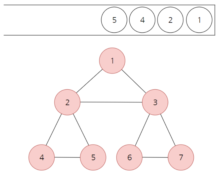 5번과 연결된 미방문 노드가 없으니 스택에서 뺀다. 마찬가지로 4,2,1번 노드를 뺀다.