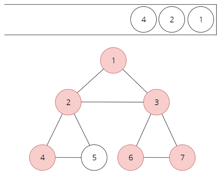 7번 노드와 연결된 노드가 더 이상 없으니 7번 노드를 스택에서 뺀다. 마찬가지로 6,3번 노드로 뺀다. 그러면 스택의 최상단 노드가 2번이 되는데 2번과 연결된 노드로 4번이 있으니 방문처리하고 스택에 넣어준다.