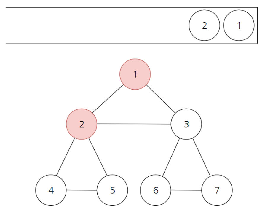 1번 노드와 연결된 2번 노드를 방문처리하고 스택에 넣어준다.