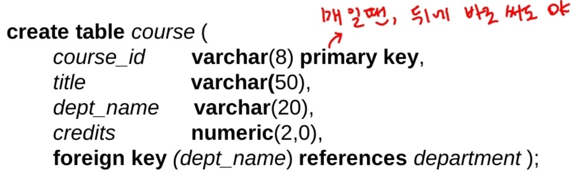 - FOREIGN KEY : 해당 컬럼의 값이 다른 relation의 기본키 값을 참조할 때, 참조하는 relation에 있는 값은 반드시 참조되는 relation에 존재해야 함!(즉, 참조되는 relation에 없는 값은 입력 불가->만약 새로운 데이터를 추가하려면 참조되는 relation에 먼저 추가해주어야 함)