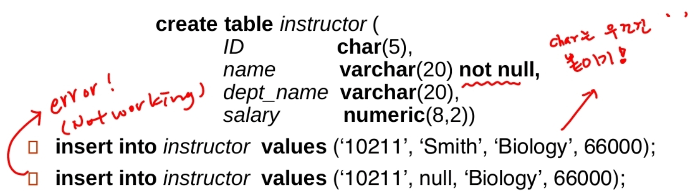 - alter table r drop A : 테이블 r에서 속성 A delete(관계형에선 문제가 될 수 있다!!!!)