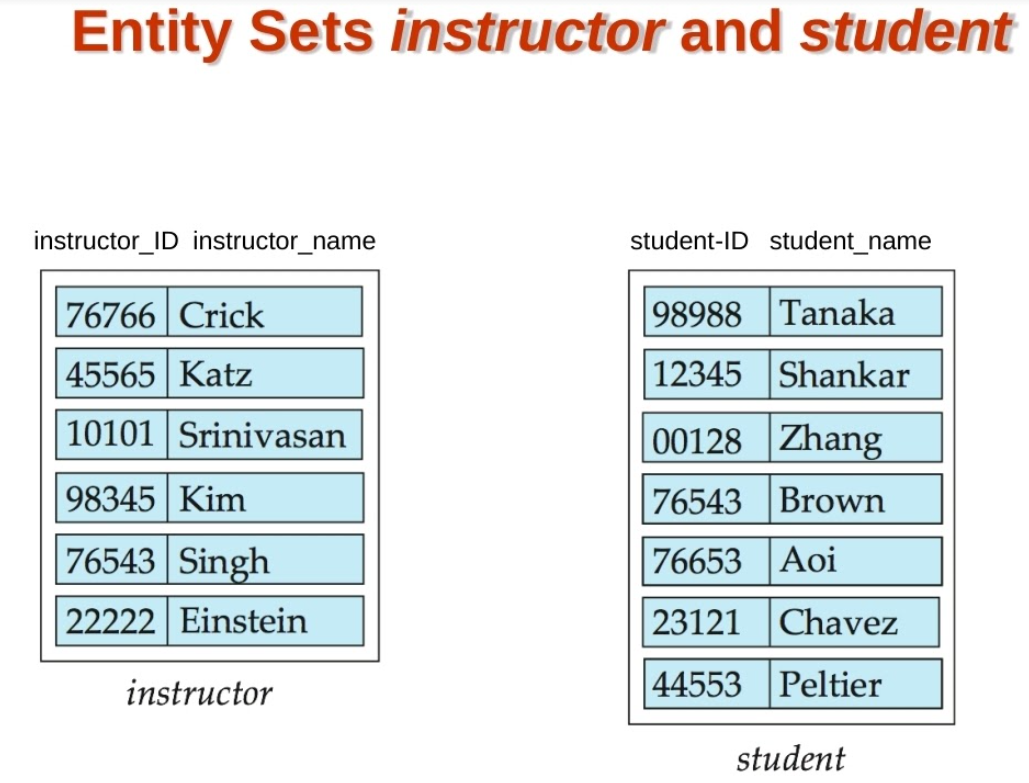 - Entity : DB에 존재하며 다른 것들과 구별되는 object(쉽게 tuple(row)로 생각하면 된다.), entity는 attribute를 갖는다. 예컨대, people는 name와 address를 갖는다. EX) instructor=(ID, name, street, city, salary)