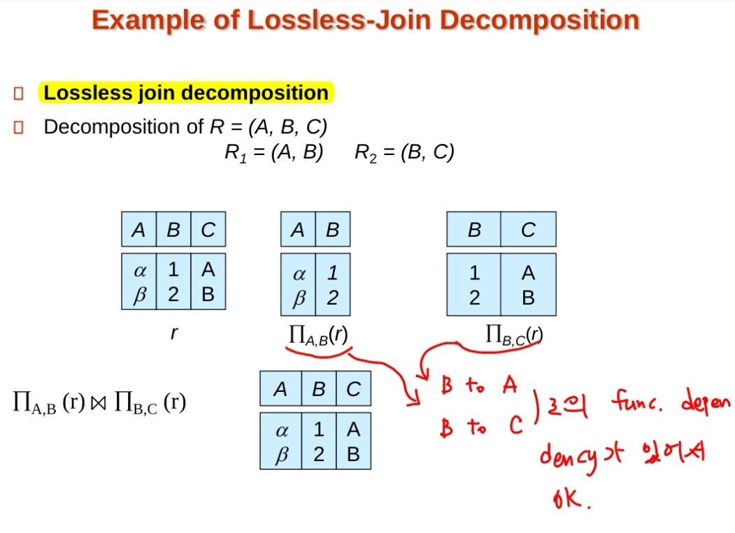 - lossless-join decomposition이다