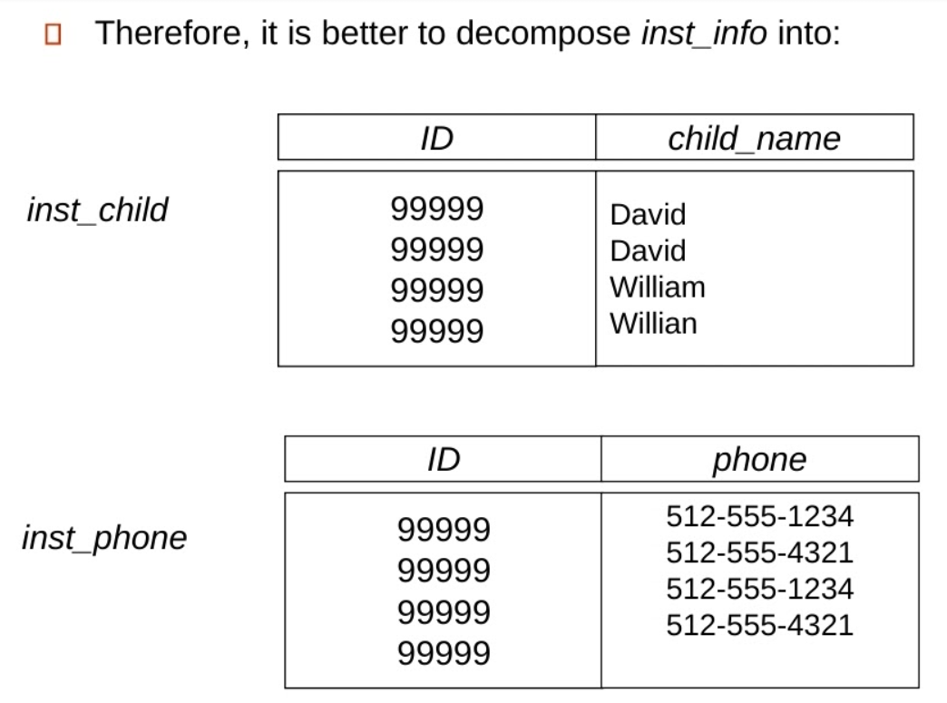 - 주로, 나뉘어진 relation에서 functional dependency가 없기 때문에 발생