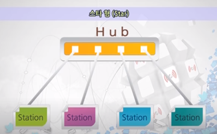 - Star형 : "허브"라는 네트워크 연결장치로 케이블을 통해 컴퓨터를 일대일로 연결. 허브를 중심으로 시스템의 배치 모양이 별과 같다 하여 Star형이라 함.