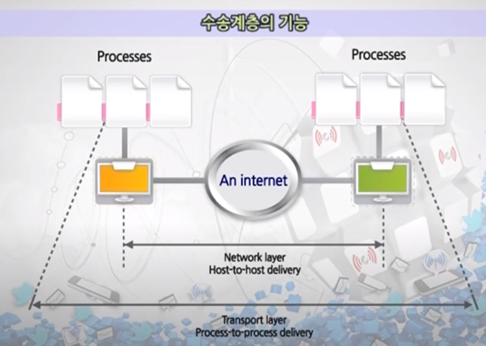 네트워크 계층은 "라우팅까지만" 책임지고, 그 안의 프로그램들은 수송계층에서 담당(즉, 송신지에서 수신지까지 보내는 것까지가 네트워크 계층의 역할이고, 그 다음 수신지에서 어떤 프로세스로 데이터를 줄지 정하는 것을 수송계층이 담당한다)