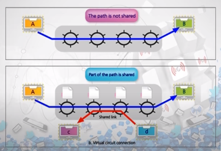 - 가상회선 방식은 회선교환 방식과 달리 링크를 다른 노드들이 공유 가능(아래 그림 참고)