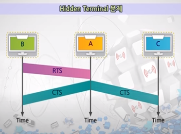 RTS(Request To Send)와 CTS(Clear To Send)를 서로 주고받는 과정이 필요하다. 쉽게 말해, RTS는 "내가 전송하려고 한다!!"고 말하는 것이고 CTS는 "그래! 지금 보내도 괜찮아!!"라고 응답하는 것이다. 아래 사진에서 B->A로 RTS를 보내자 A->B,C로 CTS를 보낸다. 이 때, C는 자신이 RTS를 보내지 않았는데 CTS를 받은 것으로부터 "지금 다른 쪽에서 전송을 시도하고 있구나!"라는 걸 알아차릴 수 있다.