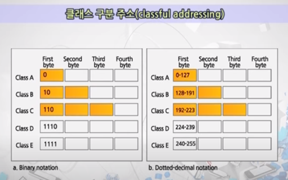 - 클래스 구분 주소에서는 IP주소가 A,B,C,D,E 5개의 클래스로 구분됨