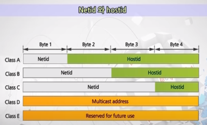 - 클래스에 따라서 네트워크 부분(Netid)와 호스트 부분(Hostid)을 구분