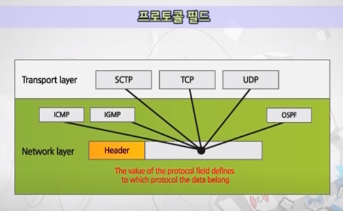 - IP계층 위에서 존재하는 상위 프로토콜이 무엇인지를 나타냄(아래 사진에서처럼 ICMP, IGMP, SCTP, TCP, UDP, OSPF 중 누구에게 보낼지를 나타냄)