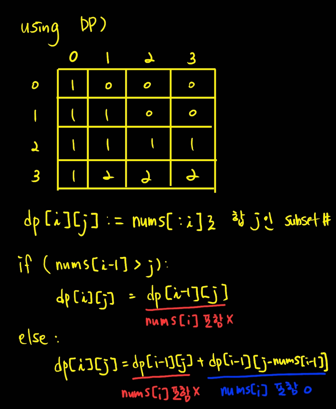 nums=[1,2,1], target=3일 때, nums에서 원소의 합이 target인 부분집합은 몇 개일까?