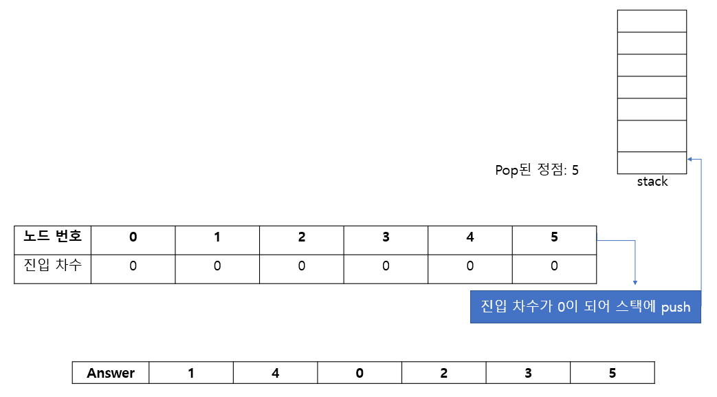 - 3과 4를 반복하며 stack에서 pop 해줄 때마다 answer 리스트에 담으면 해당 결과가 위상정렬의 결과가 된다.
