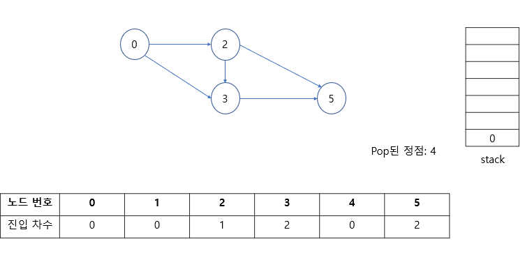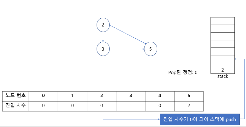 stack에서 0을 pop하고 0과 연결된 2,3의 in-degree를 -1 해준다. 그럼 2의 in-degree가 0이 되므로 2를 stack에 push해준다.