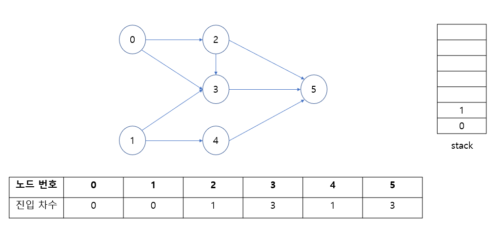 처음에 in-degree가 0인 0과 1이 stack에 push 된다.