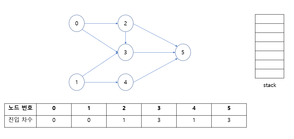 아래와 같은 그래프가 있다고 하면, in-degree(진입차수) 리스트는 아래와 같다. stack은 처음엔 비어있는 상태이다.