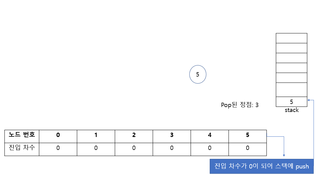 stack에서 3을 pop하고 3과 연결된 5의 in-degree를 -1 해준다. 그럼 5의 in-degree가 0이 되어 stack에 push 해준다.